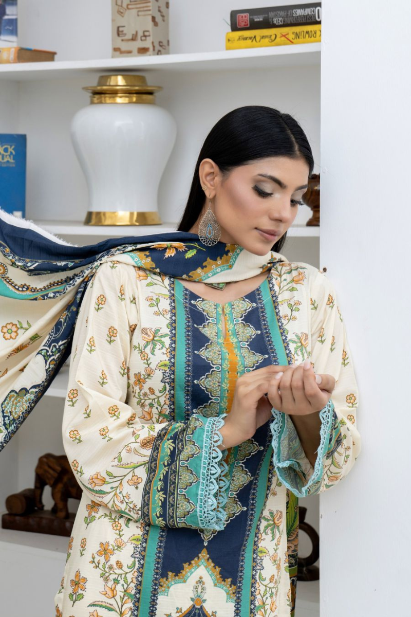 Color and Base Fabric: The suit features a creamy off-white or light beige base color with an intricate, multi-colored print. The fabric appears to be a lawn or cotton suitable for comfortable, everyday wear.