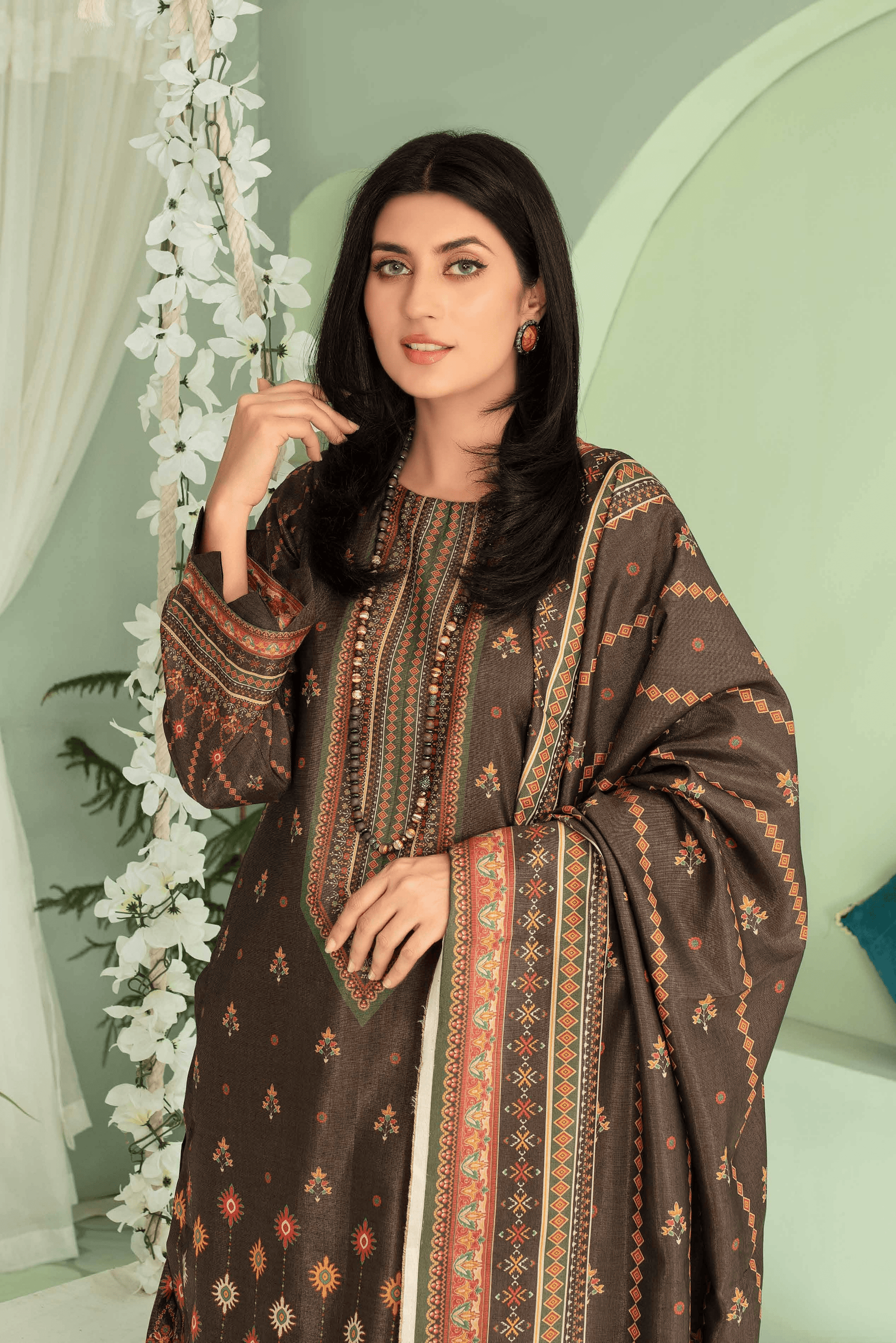 3 Pieces - Aizal Unstitched Brown Printed Shamray Linen Suit