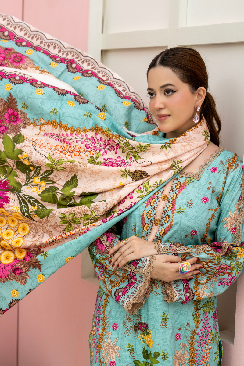 Printed Linen Dupatta: The dupatta matches the shirt's sky blue base and floral print. It is accented with a wide, intricate border that showcases bold orange, red and blue traditional motifs and geometric patterns, creating an elegant frame.